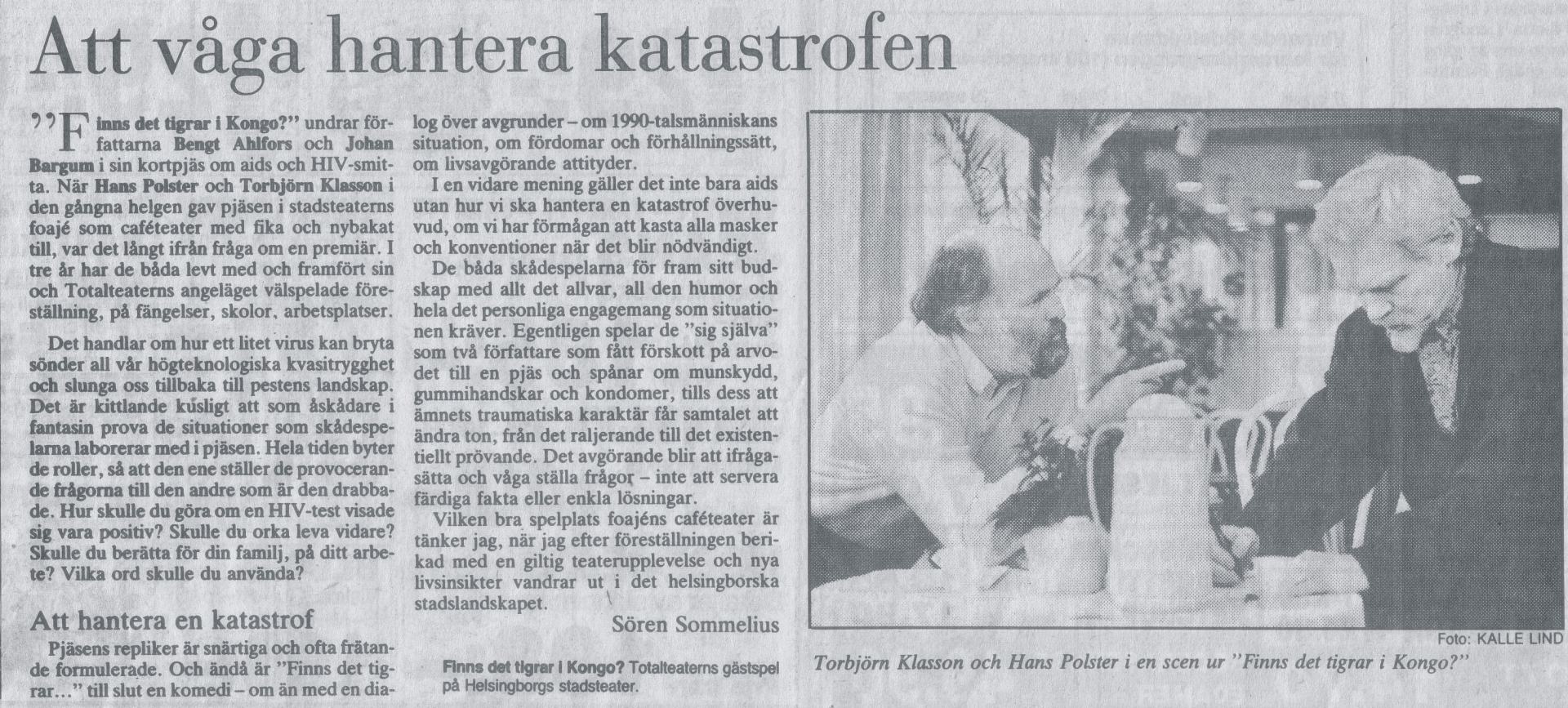 teater". Då kontaktade Hans mig, Torbjörn Klasson om att vi borde göra denna pjäs. Vi spelade sedan denna pjäs på skolor, föreningar, arbetsplatser och olika teatrar, runt om i Skåne. Detta i samarbete med läkaren Bo Johansson på smittskyddsenheten och med stöd av AIDS-delegationen. Vilket möjliggjorde att vi nådde ut till så många som vi gjorde. Denna pjäs blev sedermera filmad av Stellan Olsson, ett projekt som möjliggjordes på grund av Socialstyrelsens bidrag och stöd. |
